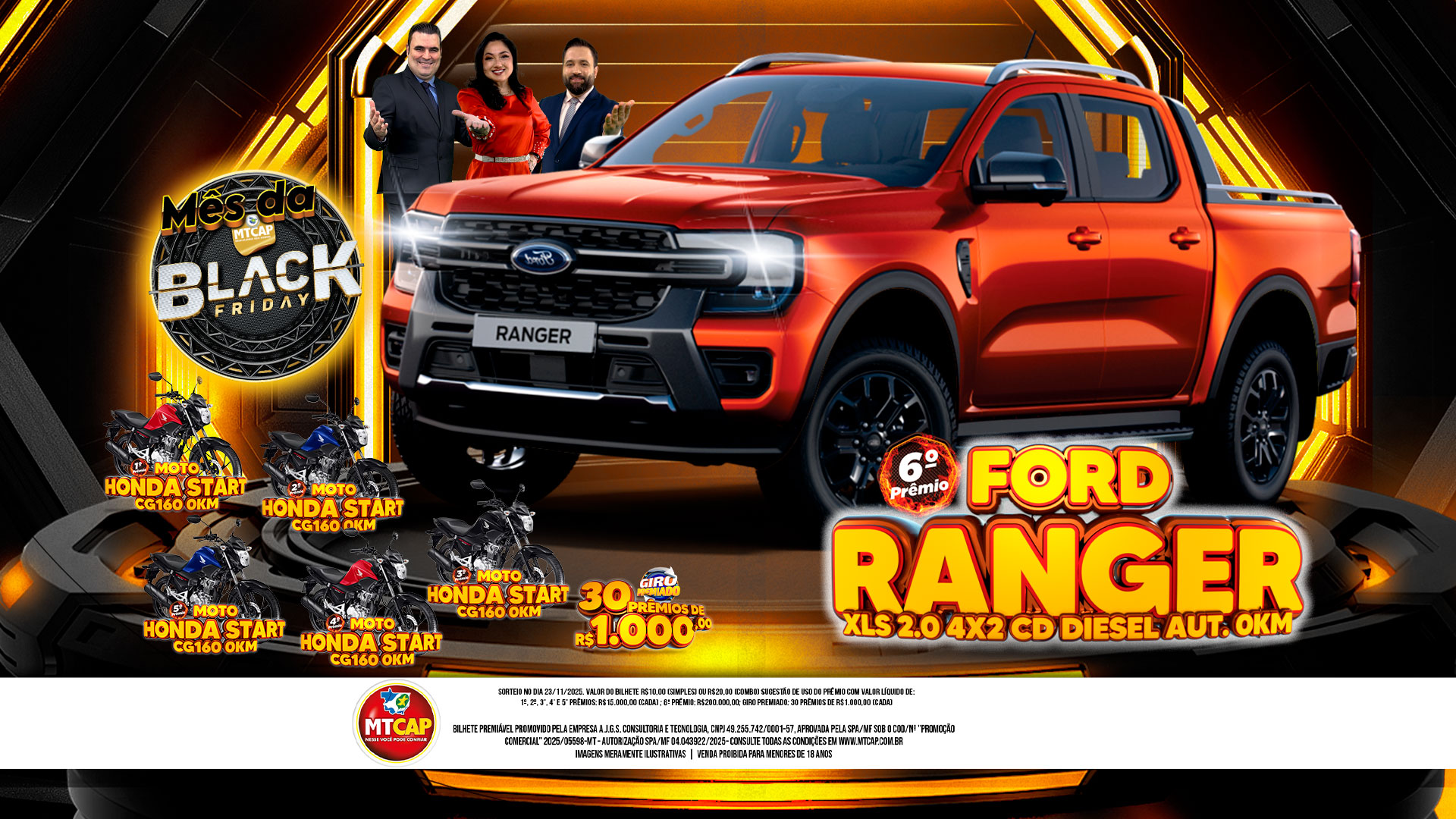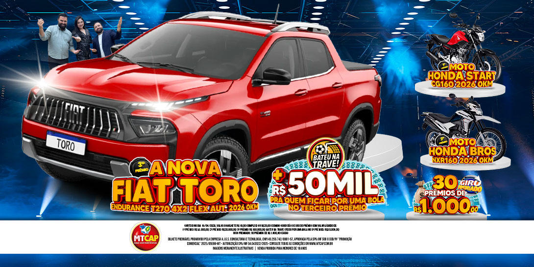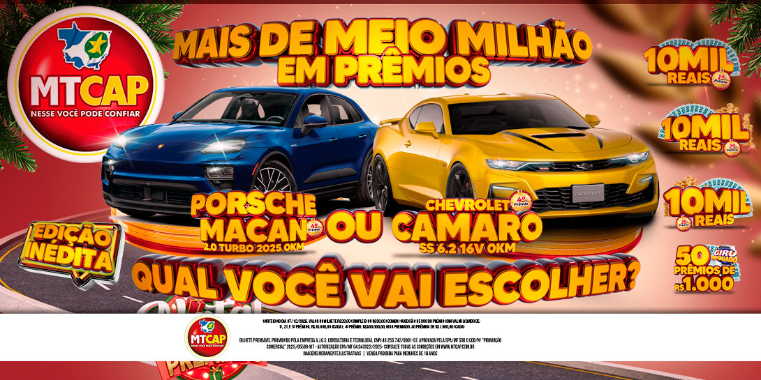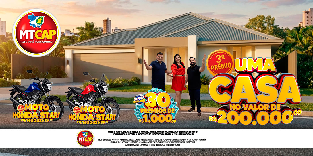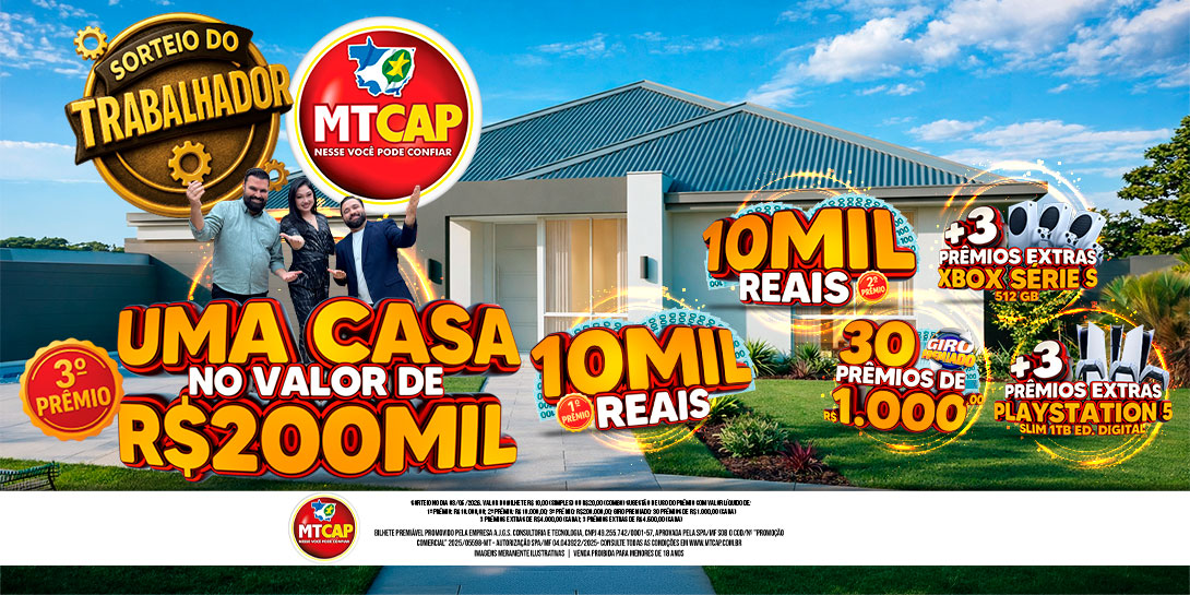 O BILHETE PREMIÁVEL MTCAP, promovida pela empresaA J G S CONSULTORIA E TECNOLOGIA CNPJ 49.255.742/0001-57, aprovada pela SPA/MF sob código/número “Promoção Comercial” 2025/05598 – MT, com sede na Rua Laika, 1994, Sala A, bairro Renascença, Teresina/PI, aprovada pela SPA/MF Certificado de Autorização nº 04.043922/2025– MTe Processo n° 17377.004473/2025-77 – MT, com base legal na Lei Federal nº 5.768/1971.Poderão ser consultadas no endereço eletrônico https://scpc.seae.fazenda.gov.br/scpc/consulta_codigo_autenticacao.jsf de acordo com o número da SPA processo constante neste regulamento.É PROIBIDA A VENDA PARA MENORES DE 18 ANOS.