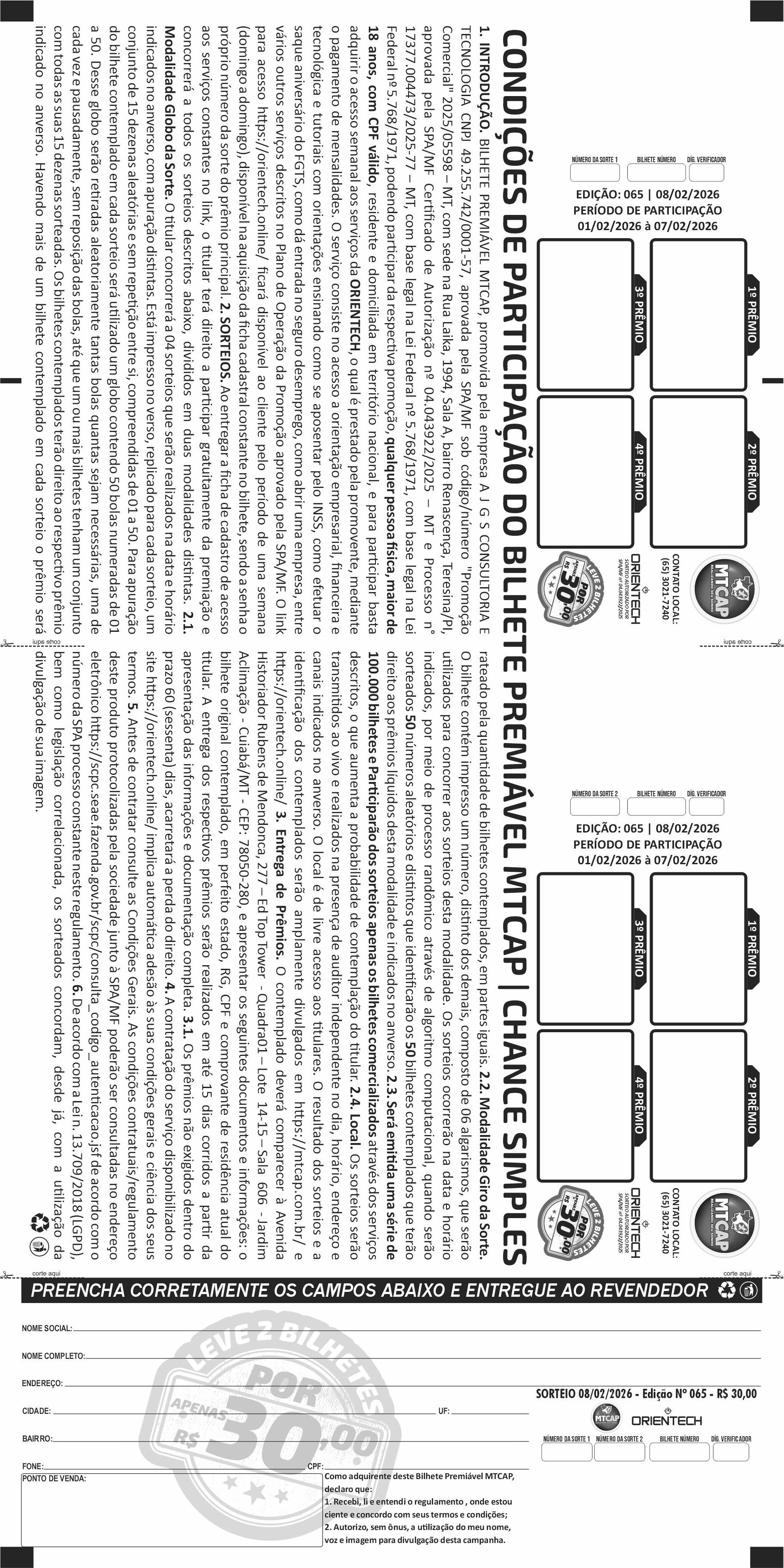 1. INTRODUÇÃO. BILHETE PREMIÁVEL MTCAP, promovida pela empresa A J G S CONSULTORIA E TECNOLOGIA CNPJ 49.255.742/0001-57, aprovada pela SPA/MF sob código/número “Promoção Comercial” 2025/05598MT, com sede na Rua Laika, 1994, Sala A, bairro Renascença, Teresina/PI, aprovada pela SPA/MF Certificado de Autorização nº 04.043922/2025 – MT e Processo n° 17377.004473/2025-77 – MT, com base legal na Lei Federal nº 5.768/1971, com base legal na Lei Federal nº 5.768/1971, podendo participar da respectiva promoção, qualquer pessoa sica, maior de 18 anos, com CPF válido, residente e domiciliada em território nacional, e para participar basta adquirir o acesso semanal aos serviços da ORIENTECH, o qual é prestado pela promovente, mediante o pagamento de mensalidades. O serviço consiste no acesso a orientação empresarial, financeira e tecnológica e tutoriais com orientações ensinando como se aposentar pelo INSS, como efetuar o saque aniversário do FGTS, como dá entrada no seguro desemprego, como abrir uma empresa, entre vários outros serviços descritos no Plano de Operação da Promoção aprovado pela SPA/MF. O link para acesso https://orientech.online/ ficará disponível ao cliente pelo período de uma semana (domingo a domingo), disponível na aquisição da ficha cadastral constante no bilhete, sendo a senha o próprio número da sorte do prêmio principal. 2. SORTEIOS. Ao entregar a ficha de cadastro de acesso aos serviços constantes no link, o titular terá direito a participar gratuitamente da premiação e concorrerá a todos os sorteios descritos abaixo, divididos em duas modalidades distintas. 2.1. Modalidade Globo da Sorte. O titular concorrerá a 03 sorteios que serão realizados na data e horário indicados no anverso, com apuração distintas. Está impresso no verso, replicado para cada sorteio, um conjunto de 15 dezenas aleatórias e sem repetição entre si, compreendidas de 01 a 50. Para apuração do bilhete contemplado em cada sorteio será utilizado um globo contendo 50 bolas numeradas de 01 a 50. Desse globo serão retiradas aleatoriamente tantas bolas quantas sejam necessárias, uma de cada vez e pausadamente, sem reposição das bolas, até que um ou mais bilhetes tenham um conjunto com todas as suas 15 dezenas sorteadas. Os bilhetes contemplados terão direito ao respectivo prêmio indicado no anverso. Havendo mais de um bilhete contemplado em cada sorteio o prêmio será rateado pela quantidade de bilhetes contemplados, em partes iguais. 2.2. Modalidade Giro da Sorte. O bilhete contém impresso um número, distinto dos demais, composto de 06 algarismos, que serão utilizados para concorrer aos sorteios desta modalidade. Os sorteios ocorrerão na data e horário indicados, por meio de processo randômico através de algoritmo computacional, quando serão sorteados 30 números aleatórios e distintos que identificarão os 30 bilhetes contemplados que terão direito aos prêmios líquidos desta modalidade e indicados no anverso. 2.3. Será emitida uma série de 100.000 bilhetes e Participarão dos sorteios apenas os bilhetes comercializados através dos serviços descritos, o que aumenta a probabilidade de contemplação do titular. 2.4. Local. Os sorteios serão transmitidos ao vivo e realizados na presença de auditor independente no dia, horário, endereço e canais indicados no anverso. O local é de livre acesso aos titulares. O resultado dos sorteios e a identificação dos contemplados serão amplamente divulgados em https://www.mtcap.com.br/ e https://orientech.online/   3. Entrega de Prêmios. O contemplado deverá comparecer à Avenida Historiador Rubens de Mendonca, 277Ed Top Tower  Quadra01Lote  14-15 Sala  606  – Jardim Aclimação – Cuiabá/MT – CEP: 78050-280, e apresentar os seguintes documentos e informações: o bilhete original contemplado, em perfeito estado, RG, CPF e comprovante de residência atual do titular. A entrega dos respectivos prêmios serão realizados em até 15 dias corridos a partir da apresentação das informações e documentação completa. 3.1. Os prêmios não exigidos dentro do prazo 60 (sessenta) dias, acarretará a perda do direito. 4. A contratação do serviço disponibilizado no site https://orientech.online/ implica automática adesão às suas condições gerais e ciência dos seus termos. 5. Antes de contratar consulte as Condições Gerais. As condições contratuais/regulamento deste produto protocolizadas pela sociedade junto à SPA/MF poderão ser consultadas no endereço eletrônico https://scpc.seae.fazenda.gov.br/scpc/consulta_codigo_autenticacao.jsf de acordo com o número da SPA processo constante neste regulamento. 6. De acordo com a Lei n. 13.709/2018 (LGPD), bem como legislação correlacionada, os sorteados concordam, desde já, com a utilização da divulgação de sua imagem.